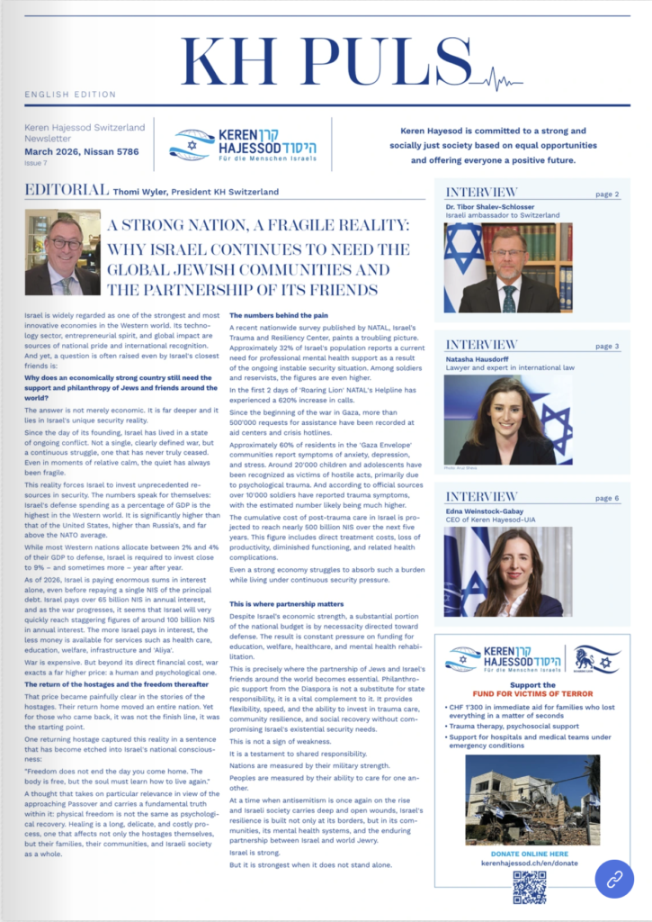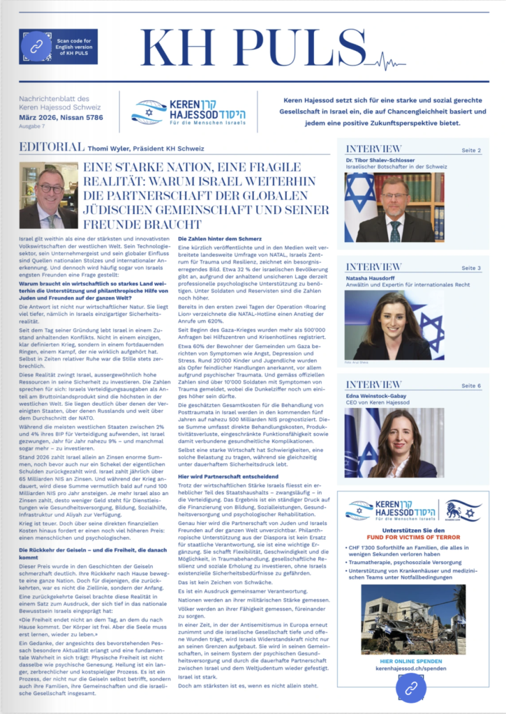 Israel durchlebt eine der schwierigsten Zeiten seiner Gründung. Seit dem 7. Oktober 2023 wächst im Inneren des Landes eine stille Krise: ein nationaler seelischer Notstand. Der längste Krieg in der Geschichte des Staates hat nicht nur viele Opfer und physisch Verletzte zu beklagen. Eine der grössten Herausforderungen der nächsten Jahre wird die Verarbeitung des psychischen Traumas sein, welches Tausende mental verwundet hinterliess.